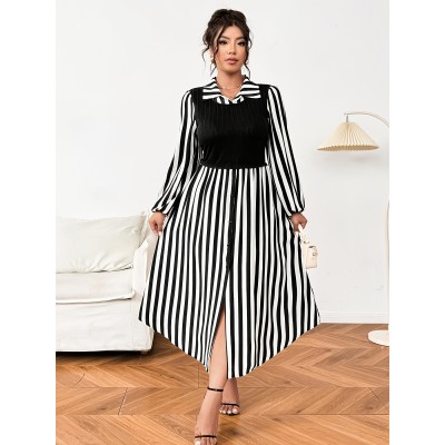 Plus Size, Plus Size Striped Print Elegant Long Sleeve Collared Shiny Shirt